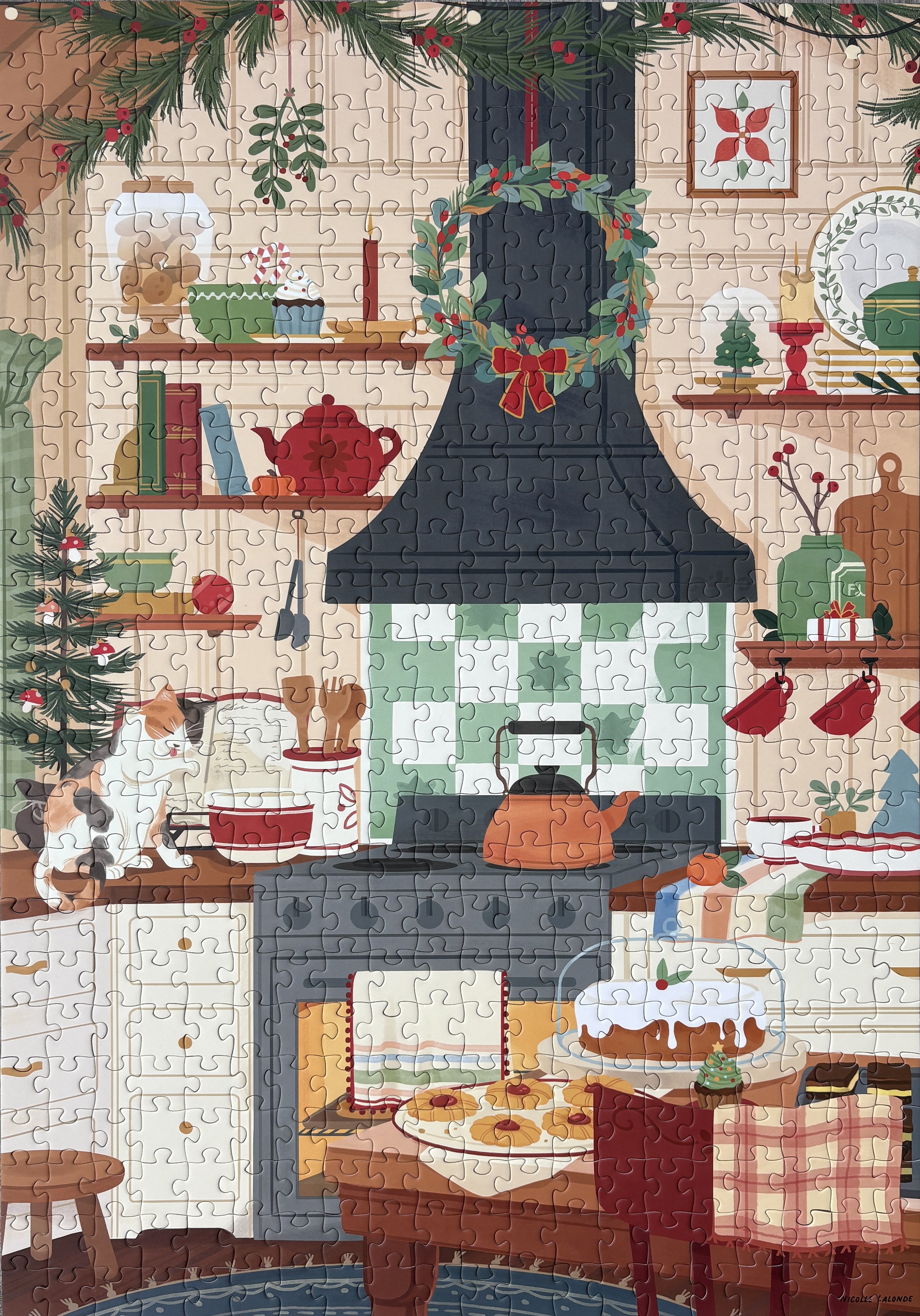 For the final BYOP of the year, the theme was, of course, “holiday puzzles”. And before this event, I did not own anything that could even remotely be considered holiday themed. Fortunately, I had recently taken advantage of a special offer at my local Indigo to stock up on discounted puzzles, and this one fit perfectly. I’m not a fan of puzzles with Christmas trees or Santas or any of the more classical images you would expect (also, they often have a ton of snow and trying to wrangle a bunch of white pieces doesn’t sound fun to me). As such, I was very happy to find this cozy image that has the word “holiday” in it and must therefore qualify. This was my second time puzzling an image from the IndigoxHobbry collection and I was feeling empowered by the possibility of just maybe being able to finish it in under an hour. Alas, it was not to be, but I am getting mighty close to that first-try sub-60.